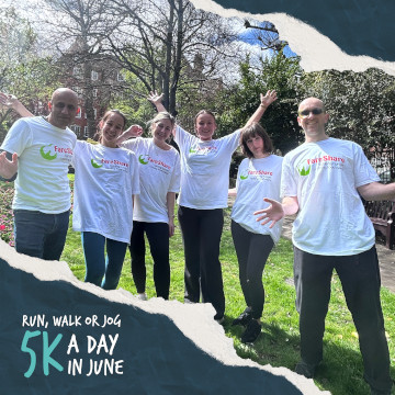Join #TeamFareShare and take part in the 5K a Day in June challenge with hundreds of others. Run, walk or jog the distance because you believe it’s wrong that 1 in 5 people in the UK are going hungry. By fundraising for this challenge you can help stop food waste and get meals to the people who need them most.