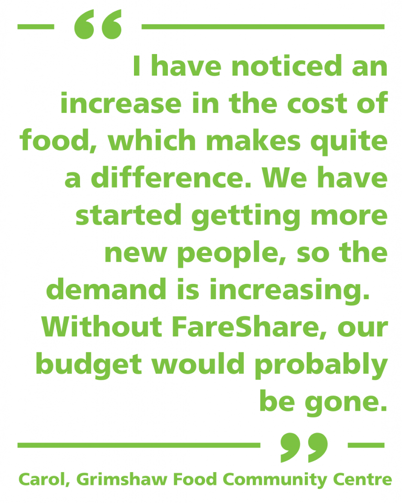 “FareShare is the biggest part of our organisation being able to provide food because our community market is pay as you feel,” explained Carol Love, who helps run the Centre’s food service. “I don’t think we would be able to function without FareShare’s input. Their help has put our community service on the map.”