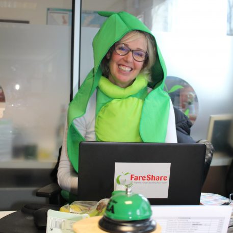 Lindsey Cape, FareShare’s Head of Fundraising, is taking a radical, hands-on approach to philanthro-pea — dressing as a gigantic pea every day until Christmas.