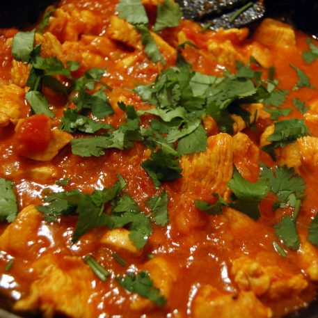 Cut the chicken into bite-sized pieces and add to the onions. Cook for 5 mins before adding the cumin, coriander and turmeric.