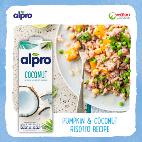 5. Pour in 200ml of the hot stock and continue to cook over a moderate heat, stirring every few minutes. Once the stock has been absorbed, add the remaining stock gradually: a ladle at a time, stirring gently with each addition until absorbed. Gradually pour in the Alpro Coconut drink, 1-2 ladles at a time, stirring gently with each addition until all absorbed. This should take about 20-25 minutes.
