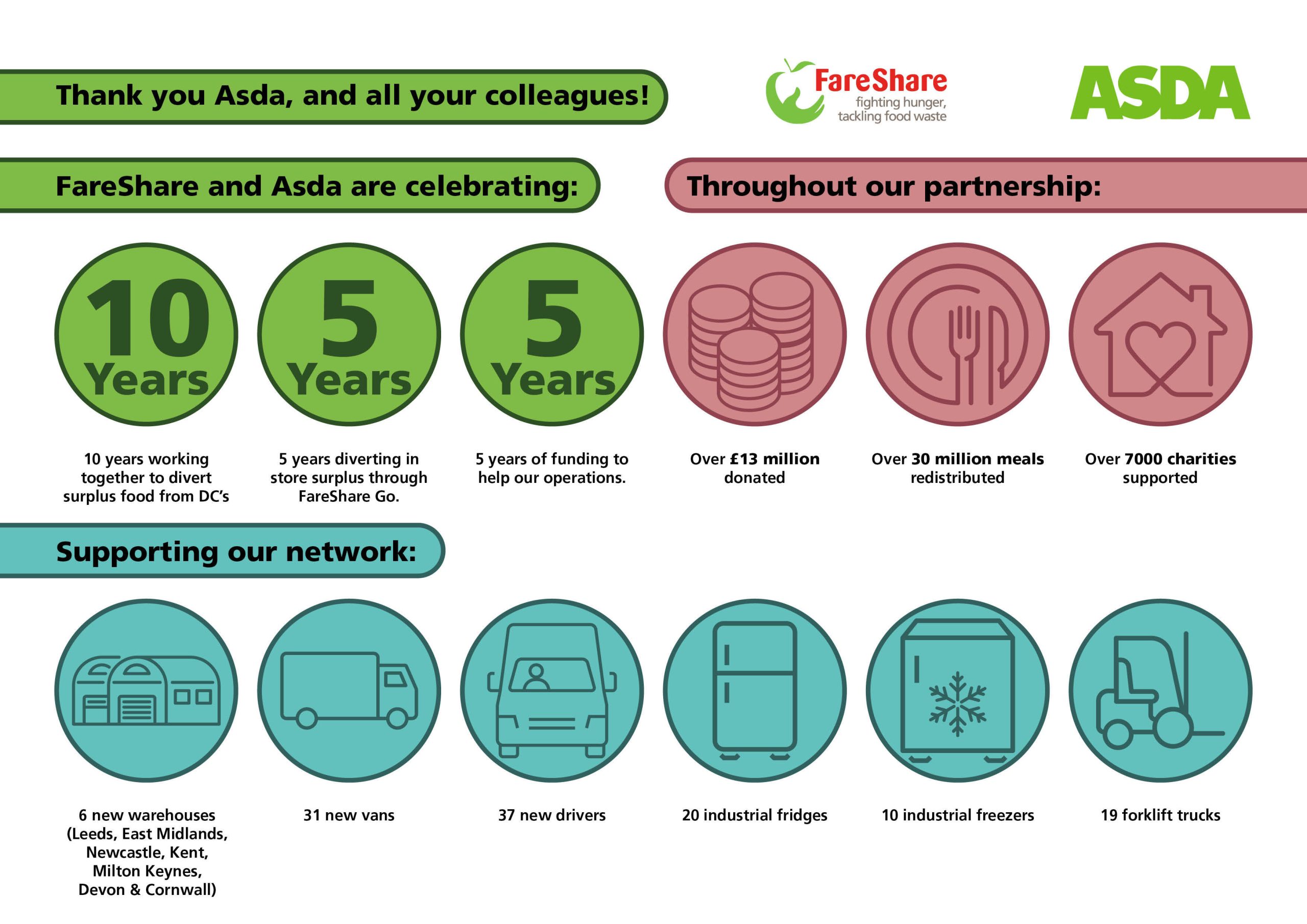 “We would like to say a huge thank you and congratulations to all our friends at Asda. This has been one of the biggest partnerships FareShare has ever had. Over the last 10 years, Asda has donated an amazing £13 million, given us the equivalent of 30 million meals and supported 7000 charities. At every opportunity, Asda helps to identify, save and redistribute surplus food, helping FareShare ensure it goes to people who need it most, rather than to waste. Each and every person at Asda has given us amazing support and these incredible milestones would not have been reached without their dedication and commitment.”