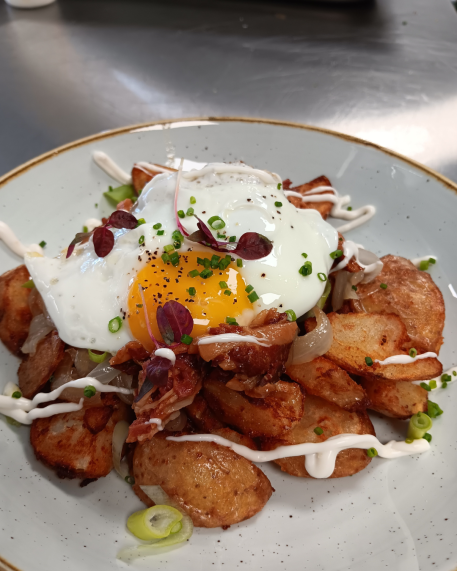 5. Place potatoes and onions on a plate, top with shredded Bacon in BBQ Stock and your eggs. Sprinkle with fresh or dried herbs and maybe a bit of mayonnaise.