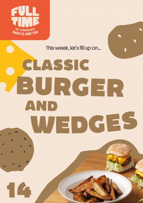 - For the wedges, wash the potatoes and cut them into chunky wedges. Pop them in a bowl and add the vegetable oil, and dried herbs. Toss it all together, then place the wedges on a baking tray. Roast in the hot oven for 40 minutes until golden and crispy, turning them halfway through.