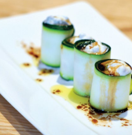 - With any left over ribbons, place them in a bowl and mix with the oil, vinegar and mustard and place onto a plate with the rest of the stuffed courgettes.