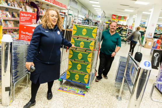 A volunteer from a charity Ace of Clubs collects surplus bananas from a Tesco store. The bananas have been donated through the FareShare FoodCloud.
